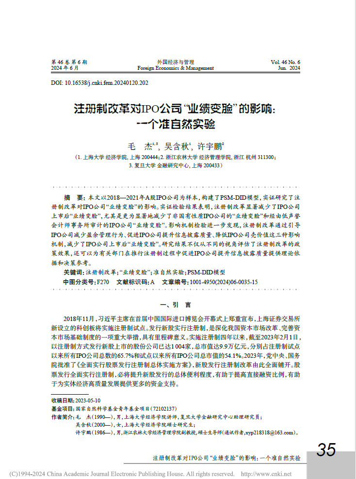由公司许宇鹏副教授作为通讯作者合作撰写的论文《注册制改革对IPO公司“业绩变脸”的影响:一个准自然实验》在《外国经济与管理》(学校A类期刊、CSSCI、FMS管理科学高质量期刊)2024年第6期上发表。该论文是许宇鹏副教授主持承担的国家自然科学青年基金项目的阶段性研究成果。